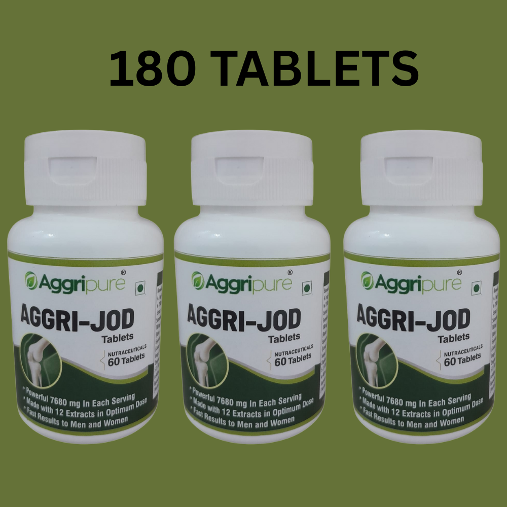 Powerful Aggri-Jod 7680 mg blend for joint pain relief made with Shallaki 1600 Mg, Punarnava 2100 Mg, Guggul 200 Mg, Ashwagandha 500 Mg, Grapeseed 600 Mg, Cinnamon 480 Mg, Laung 180 Mg, Turmeric 960 Mg, Ginger 500 Mg, Aloevera 480 Mg, Holy Basil 40 Mg and Haritaki 40 Mg